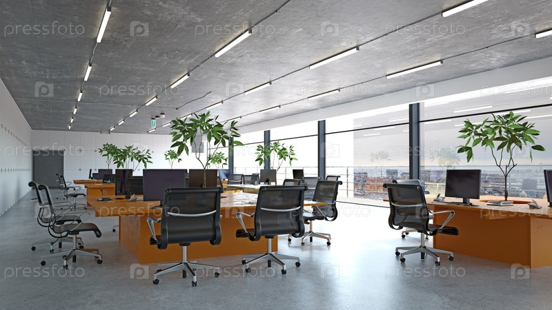 Пустая открытая планировка офиса с стульями, столами и зелеными растениями. 3D-рендеринг