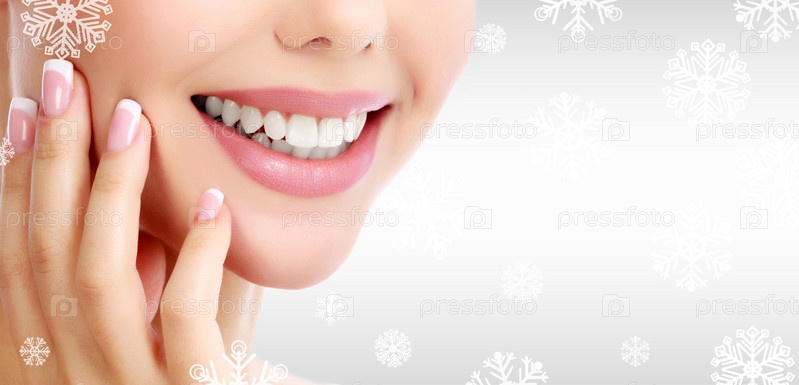 Масштабный снимок зубастой улыбки женщины на сером фоне со снежинками