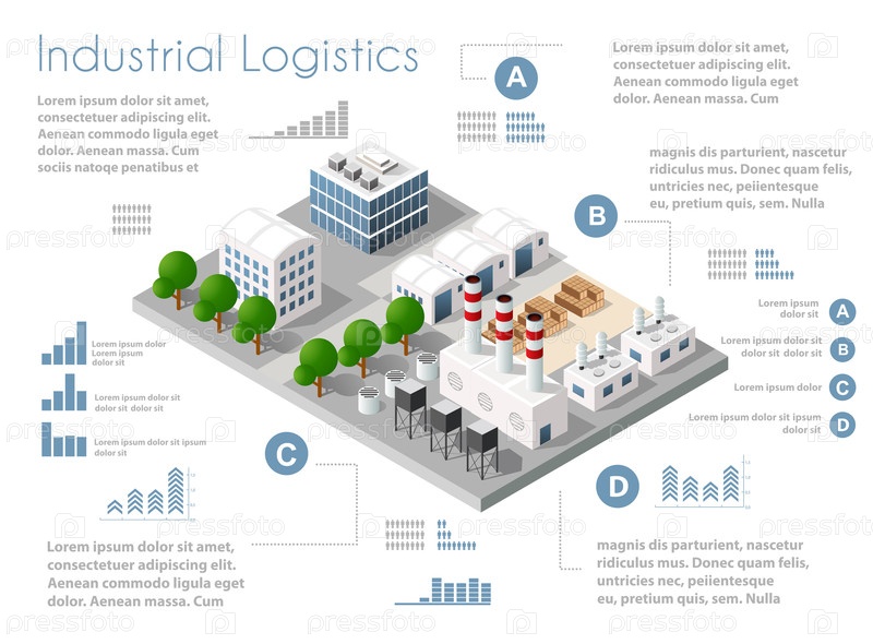 Изометрический 3D городской модуль промышленного городского завода, который включает в себя здания, электростанции, отопительный газ, склад. плоская карта изолированных инфографических элементов заданных структур