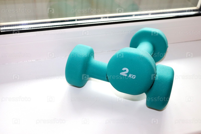 Две бирюзовые гантели весом по 2 кг лежат друг на друге на подоконнике. Спортивное оборудование для тренировки рук