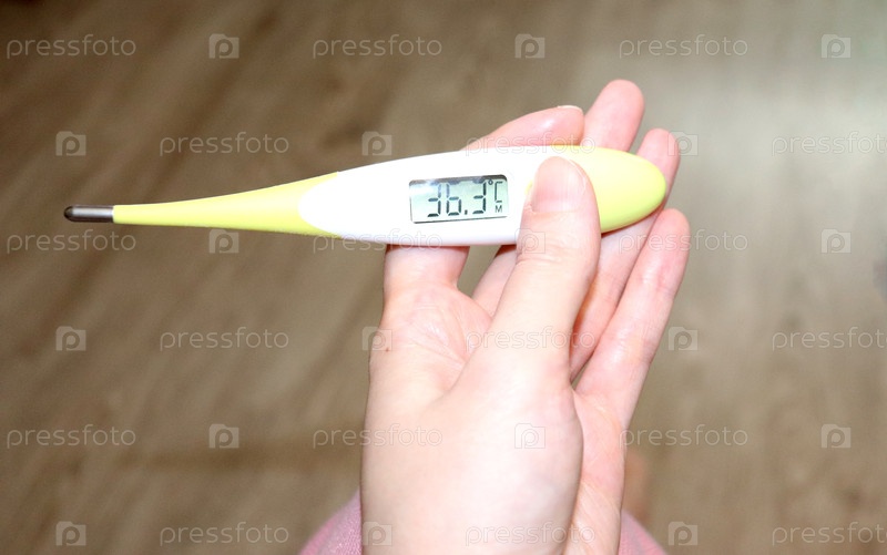 Электронный термометр в руке женщины с нормальными показаниями температуры на экране