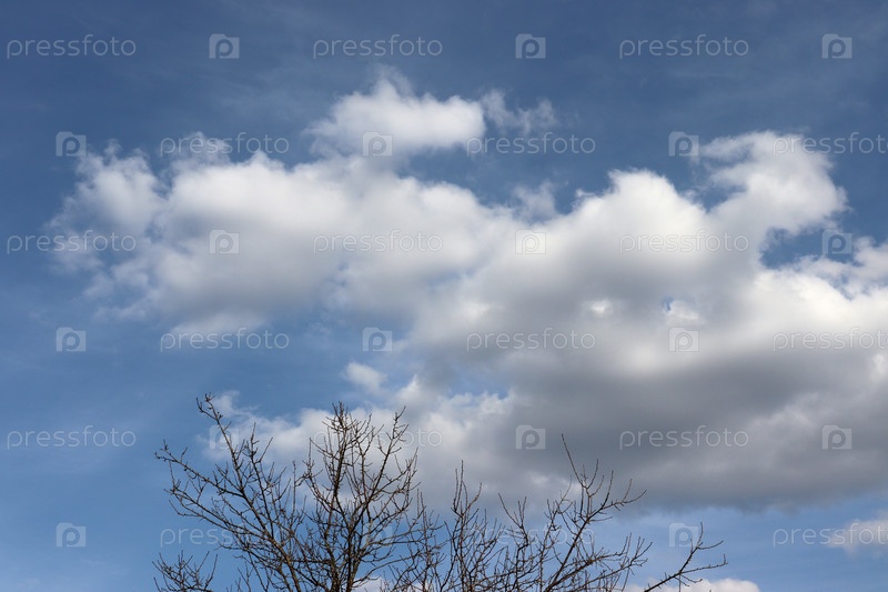 Кучевые пушистые облака на фоне голубого неба над верхушками деревьев без листвы в саду в весенний солнечный день