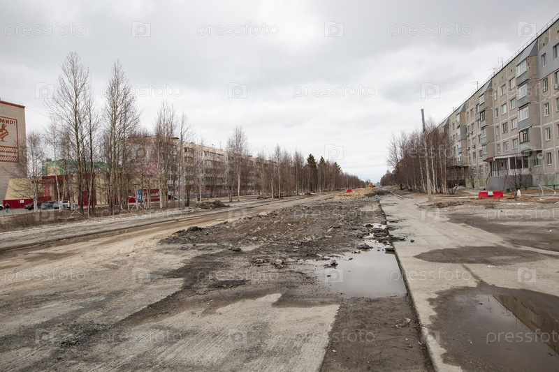 Ремонт дорог на центральной улице в городе Ноябрьске весной