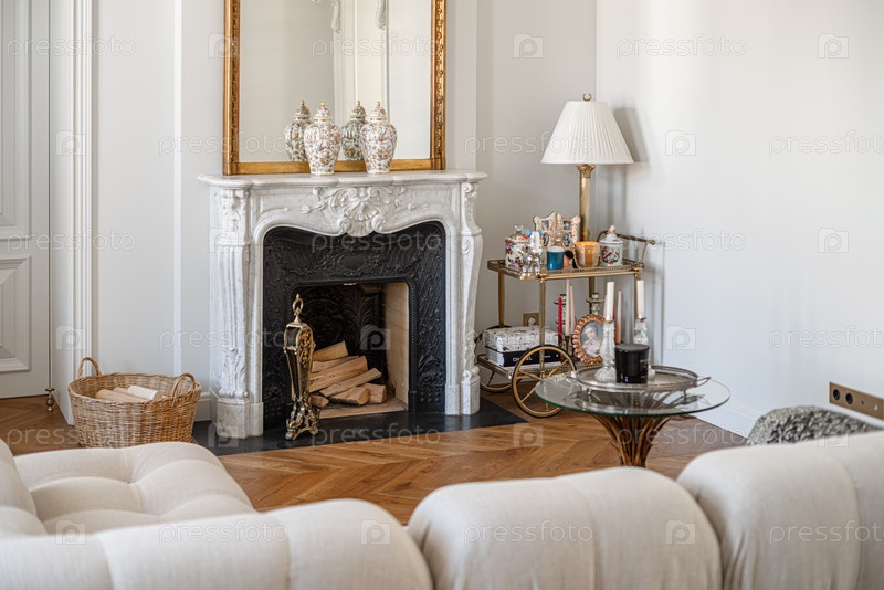 Винтажная гостиная комната с камином, зеркалом и светлым диваном