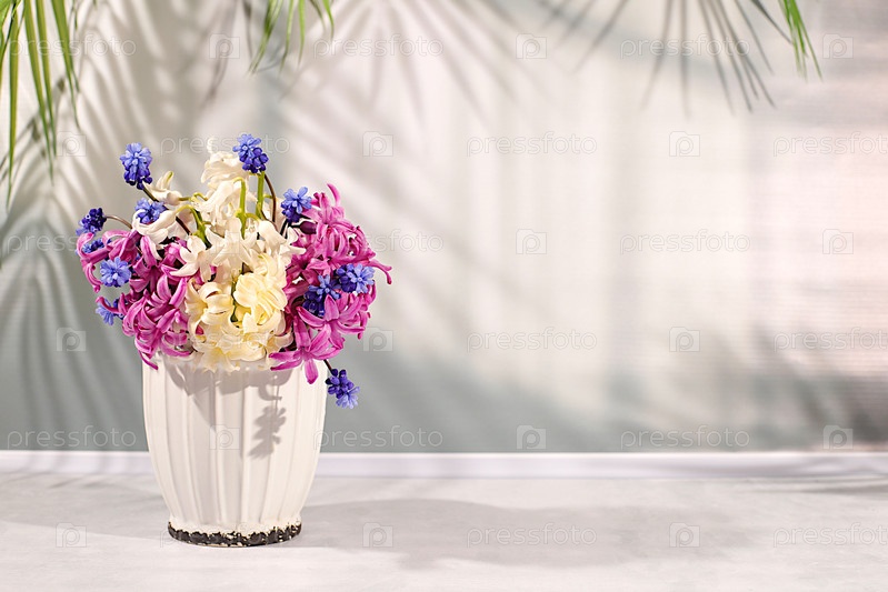 Красивая натюрморт разных сортов гиацинтов и мускари в вазе на элегантном кухонном фоне, шаблон для дизайна и экрана. Абстрактная цветочная композиция, баннер. Весенняя открытка, визитная карточка для демонстрации продукта