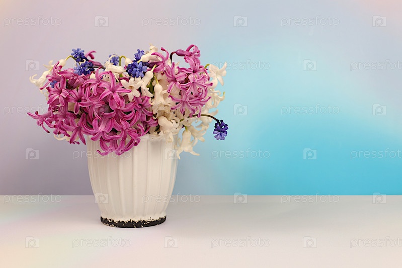 Абстрактная цветочная аранжировка для экрана и шаблон дизайна. Красивый флаер с белыми гиацинтами, нарциссами и синим мускари на элегантном ярком фоне. Весенняя открытка, элегантная концепция природной красоты, подарок для близких