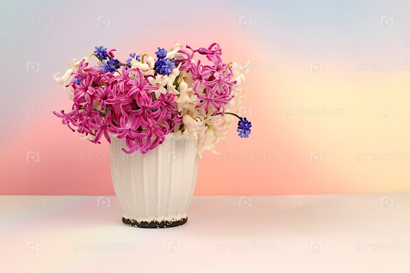 Красивый баннер различных сортов гиацинта и мускари в вазе на элегантном кухонном фоне, шаблон для дизайна и экрана. Абстрактная цветочная композиция. Весенняя открытка, визитная карточка для демонстрации продукта