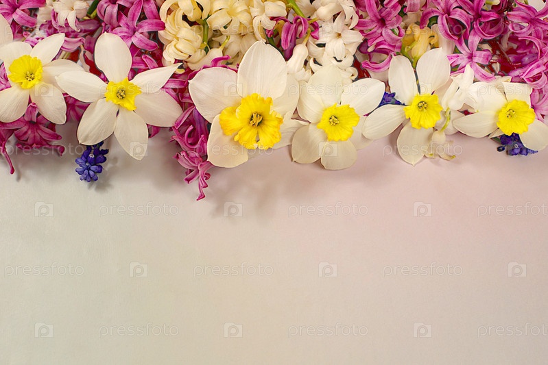 Абстрактная цветочная аранжировка для экрана и шаблон дизайна. Красивый флаер с белыми гиацинтами, нарциссами и синим мускари на элегантном ярком фоне. Весенняя открытка, элегантная концепция природной красоты, подарок для близких