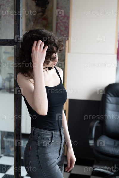 Портрет молодой красивой женщины с вьющимися волосами в студии