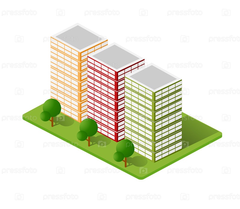Изометрические дома, таунхаусы, небоскребы и улицы выполнены в перспективной проекции для дизайнерских площадок, бизнес-порталов и агентств недвижимости