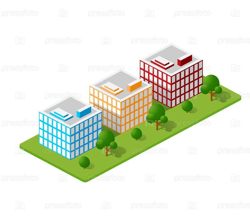 Изометрические дома, таунхаусы, небоскребы и улицы выполнены в перспективной проекции для дизайнерских площадок, бизнес-порталов и агентств недвижимости