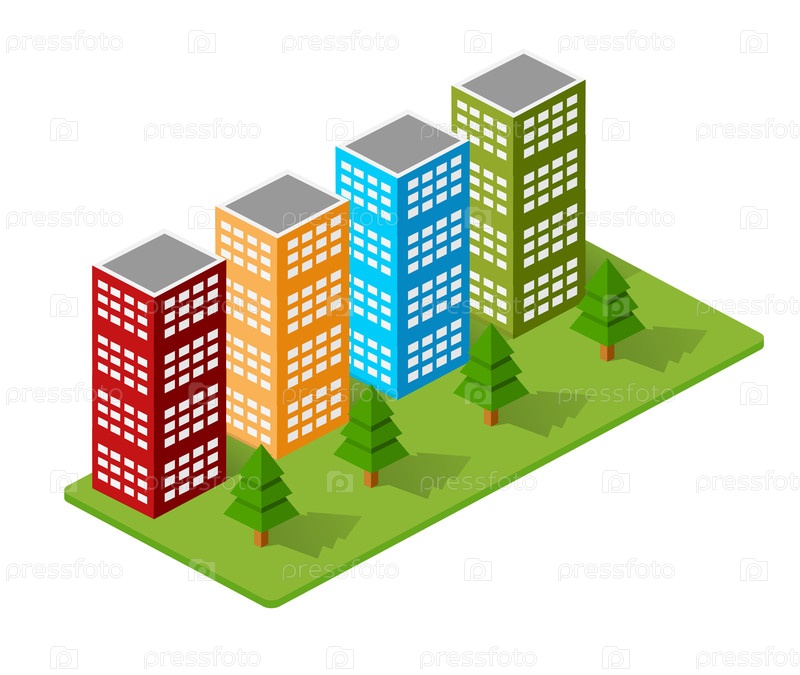 Изометрические дома, таунхаусы, небоскребы и улицы выполнены в перспективной проекции для дизайнерских площадок, бизнес-порталов и агентств недвижимости