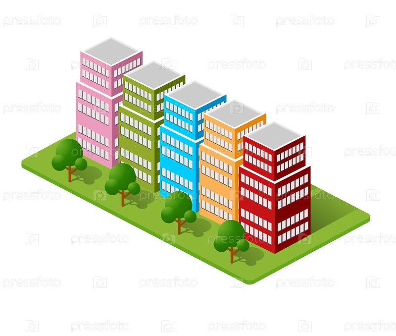 Изометрические дома, таунхаусы, небоскребы и улицы выполнены в перспективной проекции для дизайнерских площадок, бизнес-порталов и агентств недвижимости