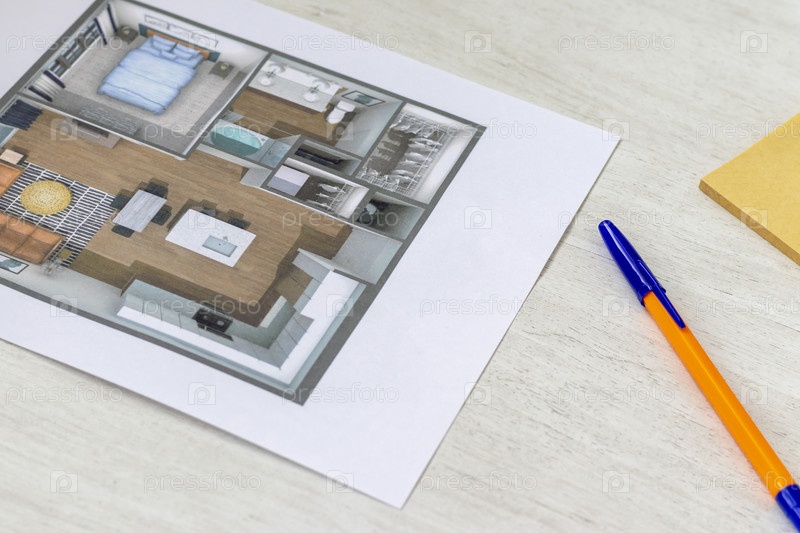 Планировка маленькой меблированной квартиры, напечатанной на листе бумаги, помещенном на стол. Внутренний интерьер