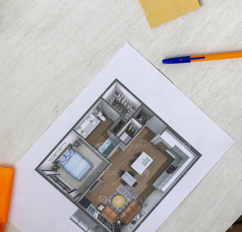 Планировка маленькой меблированной квартиры, напечатанной на листе бумаги, помещенном на стол. Внутренний интерьер