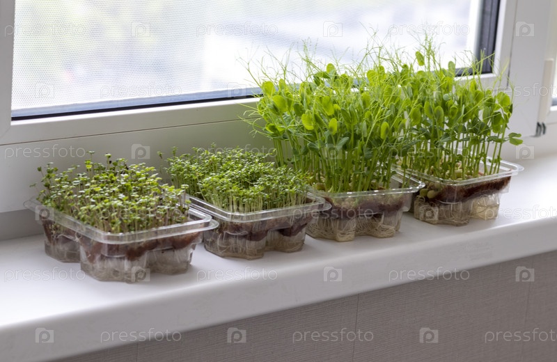 Свежепроросшие побеги микрозелени в пластиковых контейнерах на джутовом коврике. Размещается на подоконнике на балконе современной квартиры. Еда