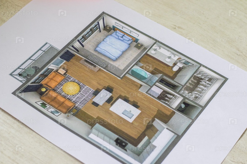 Планировка маленькой меблированной квартиры, напечатанной на листе бумаги, помещенном на стол. Внутренний интерьер