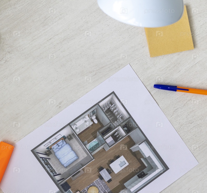 Планировка маленькой меблированной квартиры, напечатанной на листе бумаги, помещенном на стол. Внутренний интерьер