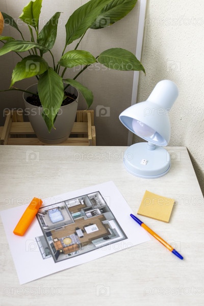 Планировка маленькой меблированной квартиры, напечатанной на листе бумаги, помещенном на стол. Внутренний интерьер