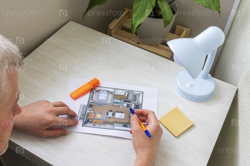 Мужчина изучает планировку маленькой меблированной квартиры, напечатанной на листе бумаги, размещенном на столе. Внутренний интерьер