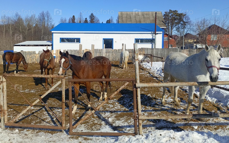 Смешанные породистые лошади, стоящие в заснеженном коралле рядом с фермерскими зданиями