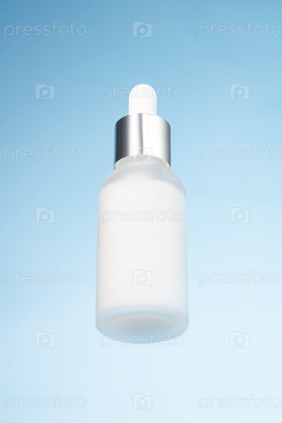 Белая небрендовая бутылка капельницы на стекле на синем фоне. Презентация продукции по уходу за кожей. Модная витрина. вид сверху