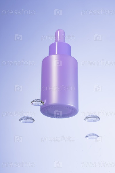 Фиолетовая капельница косметического продукта с сывороткой на стеклянной полке и каплями воды на синем фоне, вид снизу. Концепция ухода за кожей
