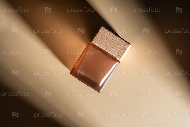 Eau de parfum, парфюмерно-парфюмерный косметический макет, брендинг предметов роскоши, квадратная бутылка с деревянной крышкой, стеклянная бутылка с резкими тенями
