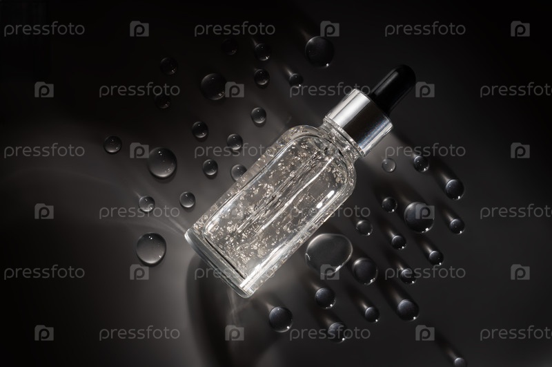 Стеклянная бутылка лицевого эфирного масла или сывороточная упаковка на сером матовом фоне с большим количеством прозрачных капель воды. Косметический продукт красоты для концепции ухода за кожей. Минимальный и роскошный стиль