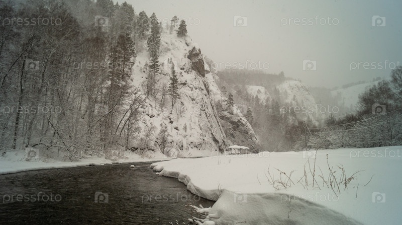Заснеженный горный пейзаж с рекой «Мурадымовское ущелье»