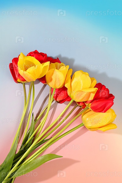 Букет с красивыми весенними цветущими тюльпанами. Абстрактная цветочная композиция на элегантном солнечном фоне, Флоральная праздничная открытка с концепцией летнего приветствия, экранный баннер, все еще жизнь