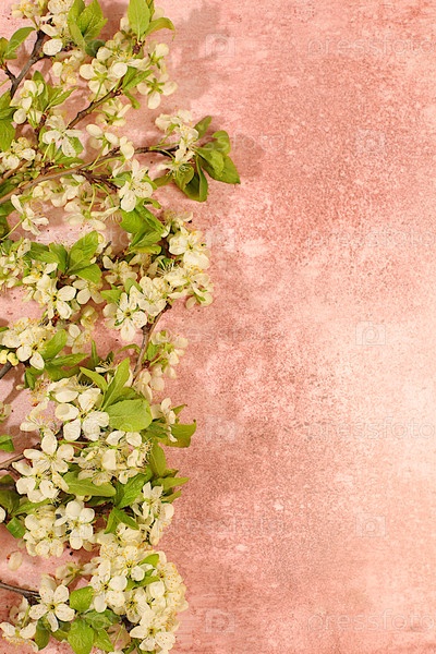 Абстрактная цветочная композиция с красивыми весенними ветвями цветения вишни на бетонном солнечном фоне. Натюрморт с пространством для текста, цветочная открытка с концепцией летнего приветствия, баннер