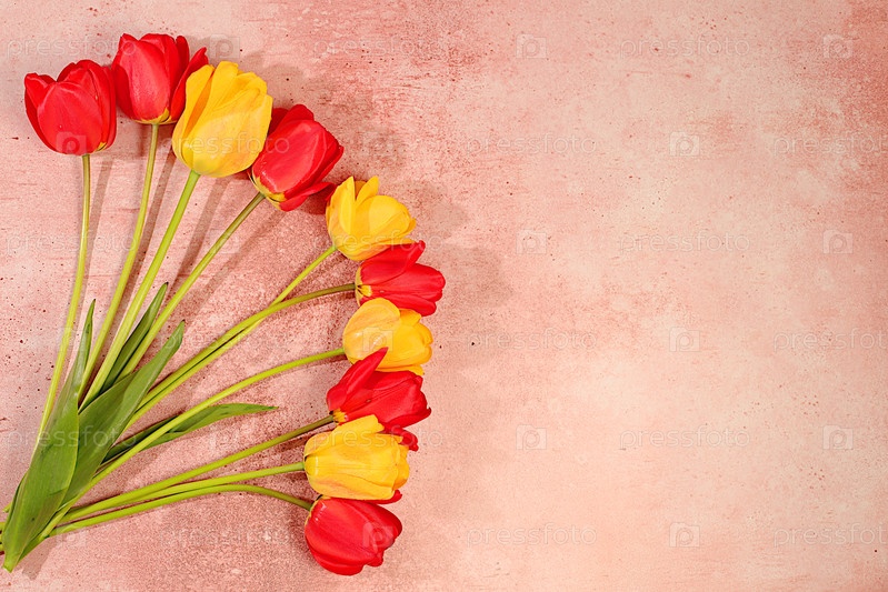 Букет с красивыми весенними цветущими тюльпанами. Абстрактное цветочное расположение на розовом бетонном фоне, Флоральная праздничная открытка с концепцией летнего приветствия, экранный баннер. Натюрморт