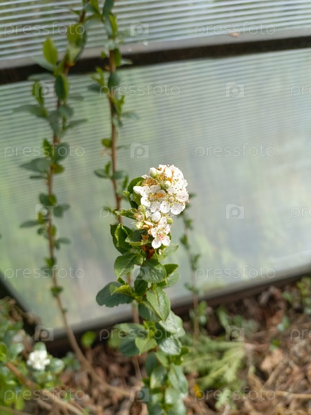 Белый цветочный кластер ежевики на молодом растении в теплице при мягком дневном свете