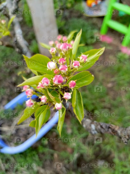 Розовые грушевые цветочные почки, цветущие на ветках со свежими листьями в весеннем саду