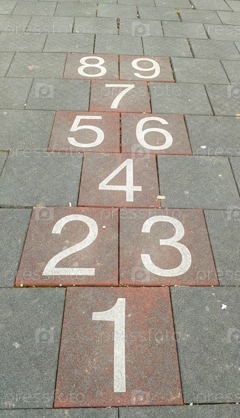 Детский хопскоч, выполненный из пронумерованной плитки различных цветов, тянется по городскому тротуару, поощряя игривые занятия в солнечный день