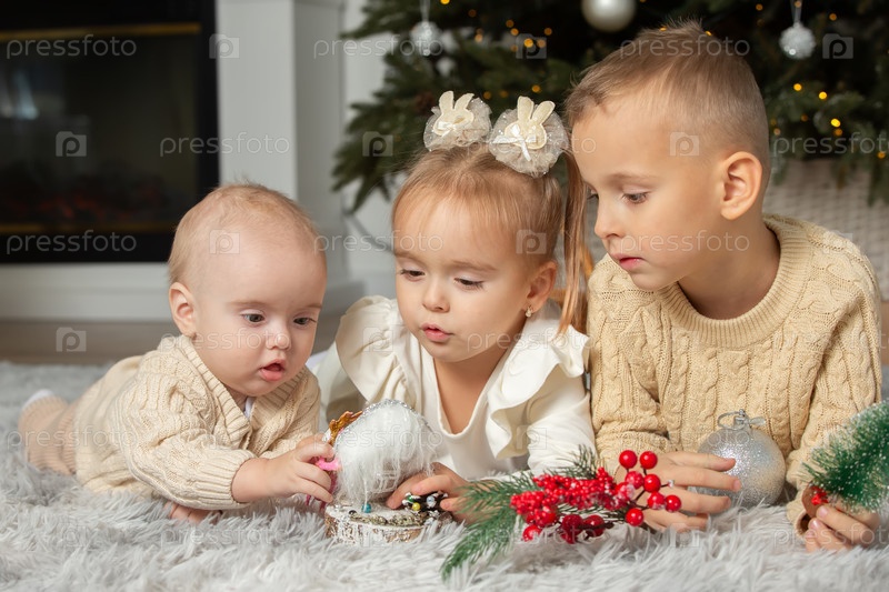 Маленькие братья и сестры на рождественской елке. Дети в канун Рождества