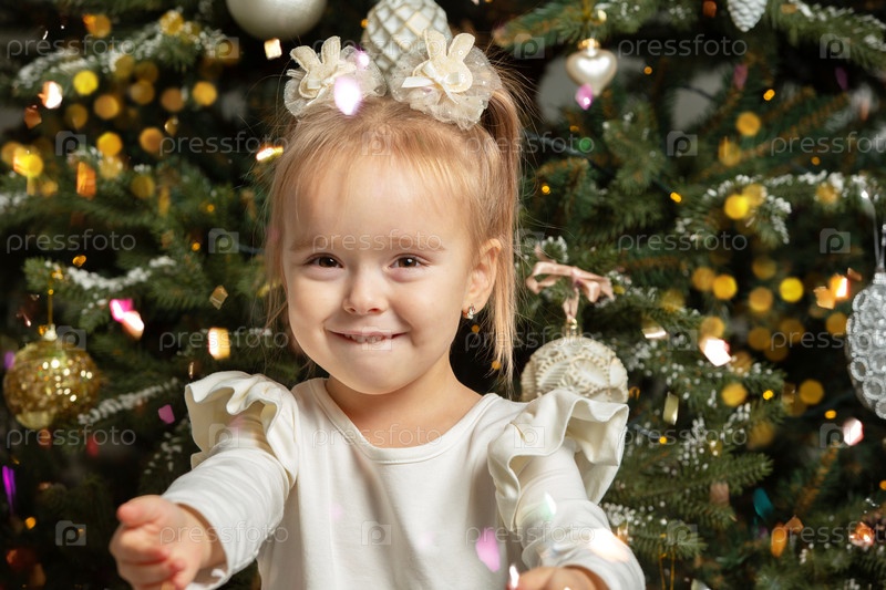Счастливая маленькая девочка на фоне рождественской елки и золотого конфетти