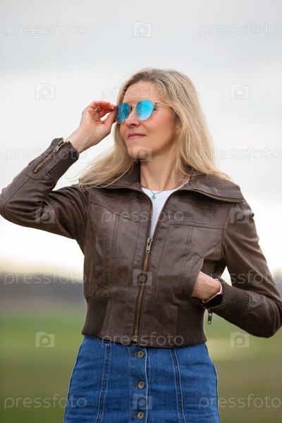 Женщина в коричневой кожаной куртке и синих джинсах улыбается и носит солнцезащитные очки. Концепция доверия и стиля