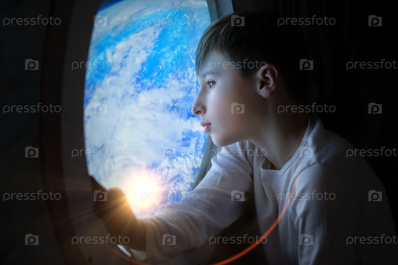 Мальчик смотрит из окна самолета на Землю. Мальчик смотрит на солнце, которое ярко светит
