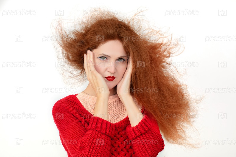 Женщина с рыжими волосами носит красный свитер и делает лицо. Она злится или расстроена