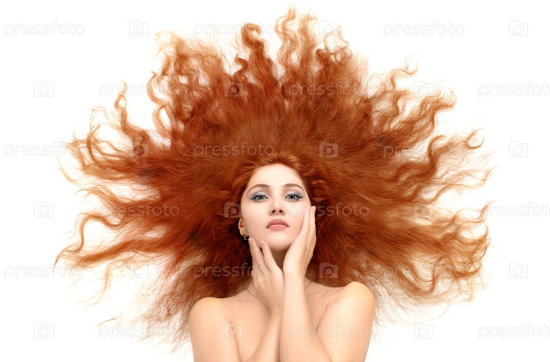 Молодая красивая рыжеволосая девушка с разбросанными длинными роскошными волосами на белом фоне
