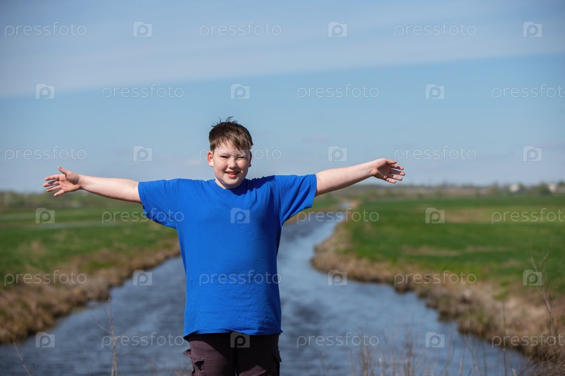 Мальчик-подросток стоит на фоне реки с вытянутыми в сторону руками