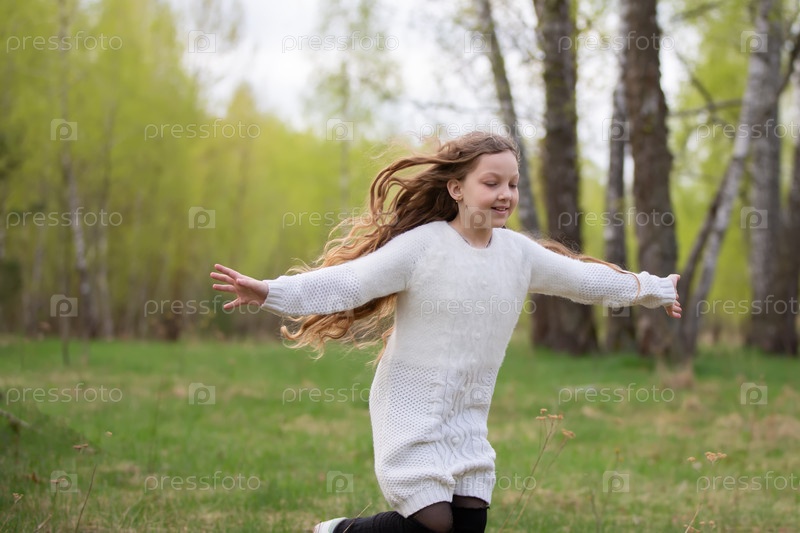 Маленькая девочка бежит через весенний лес. Ребенок гуляет в парке
