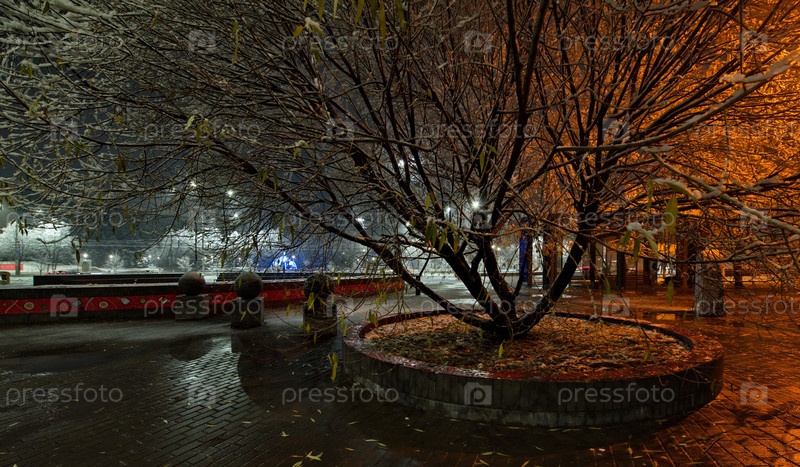 Новокузнецк, Россия. 01 ноября 2024 года. Живописный вид на деревья городского парка, покрытые первым осенним снегом и подсвеченные фонарями теплого и холодного света