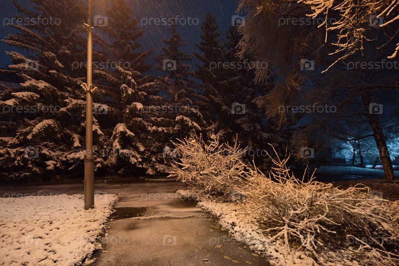 Новокузнецк, Россия. 01 ноября 2024 года. Живописный вид на деревья городского парка, покрытые первым осенним снегом и подсвеченные фонарями теплого и холодного света