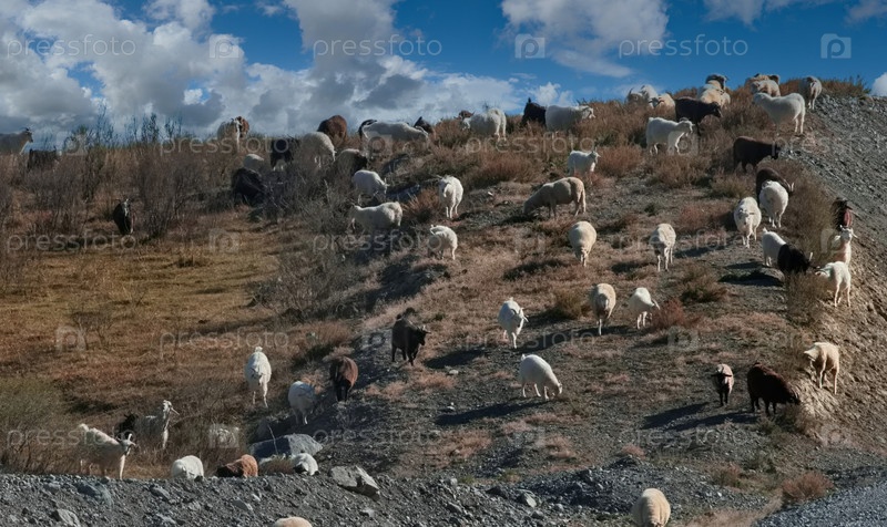 Россия. Юг Западной Сибири. Горный Алтай. Небольшая отара домашних овец пасется на холмах рядом с грунтовой дороги