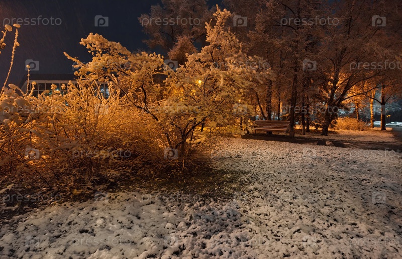 Новокузнецк, Россия. 01 ноября 2024 года. Живописный вид на деревья городского парка, покрытые первым осенним снегом и подсвеченные фонарями теплого и холодного света