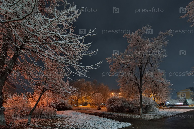 Новокузнецк, Россия. 01 ноября 2024 года. Живописный вид на деревья городского парка, покрытые первым осенним снегом и подсвеченные фонарями теплого и холодного света