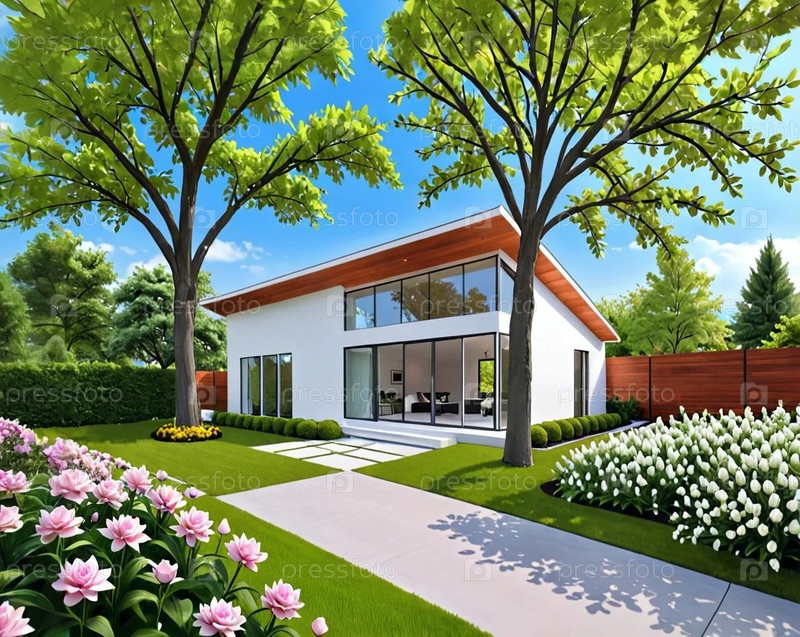 Двухэтажный стильный дом в облагороженном саду с цветами деревьями
